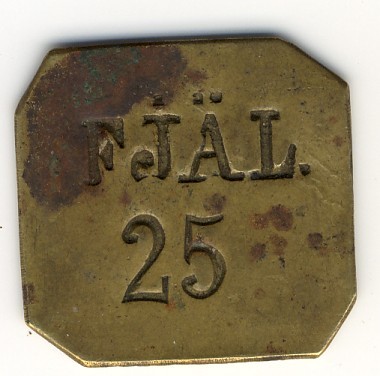 Framsida: FJÄL. 25 Baksida: (ensidig) Material: Mässing Diameter: 27mm